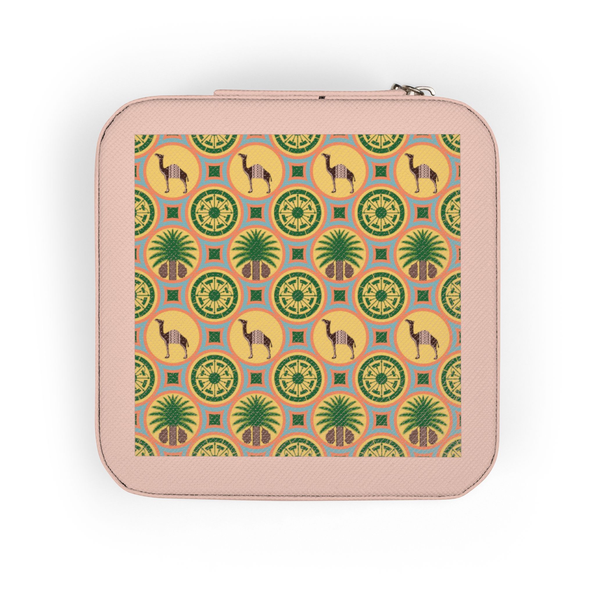 A compact, lovingly designed jewelry travel case that keeps your everyday treasures safe and organized whether you’re headed across town or across the ocean. Soft PU leather on the outside and a plush fabric lining inside cradle rings, studs, chains and charms. The square zip-around shell fits easily into a purse or carry-on, while divided compartments, ring rolls and necklace hooks stop tangles and scratches before they start. The printed top adds personality — small enough to tuck into a toiletry bag, large enough for your go-to pieces. Reach for it when you want your jewelry ready, protected, and beautifully presented.