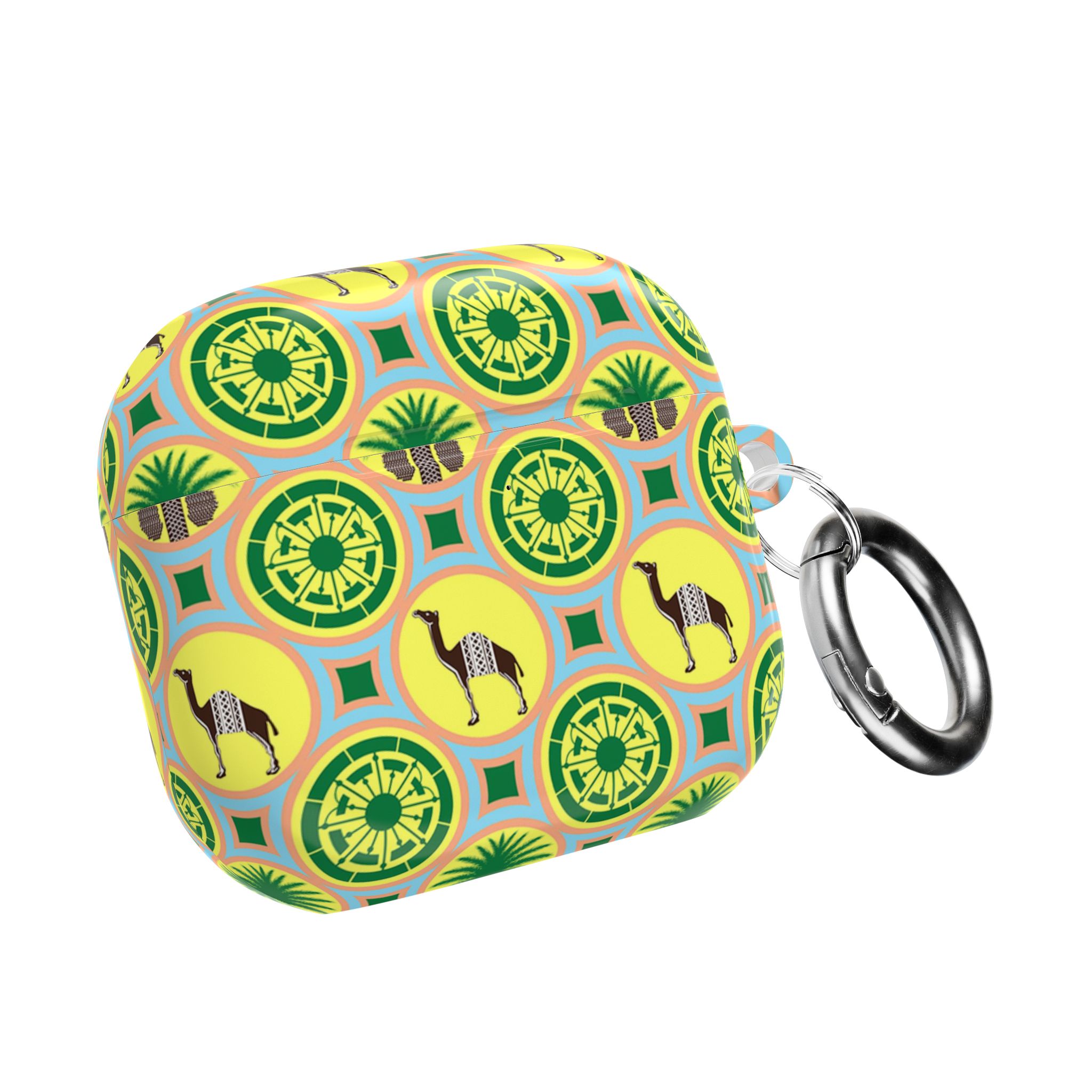 Bright, playful protection for your AirPods that turns a small everyday item into a joyful accent. The glossy polycarbonate shell feels sleek and light while standing up to daily bumps and scratches. A repeating motif of stylized camels, palm fronds, and geometric medallions in cheerful yellow and green gives the case a retro, travel-inspired vibe — like a tiny souvenir from an imagined sun-soaked market. The slim profile keeps wireless charging accessible and the included carabiner clips to a bag or belt loop so your earbuds are always within reach. Made in South Korea with durable materials and safety-conscious manufacturing, this case pairs practical protection with a burst of personality.