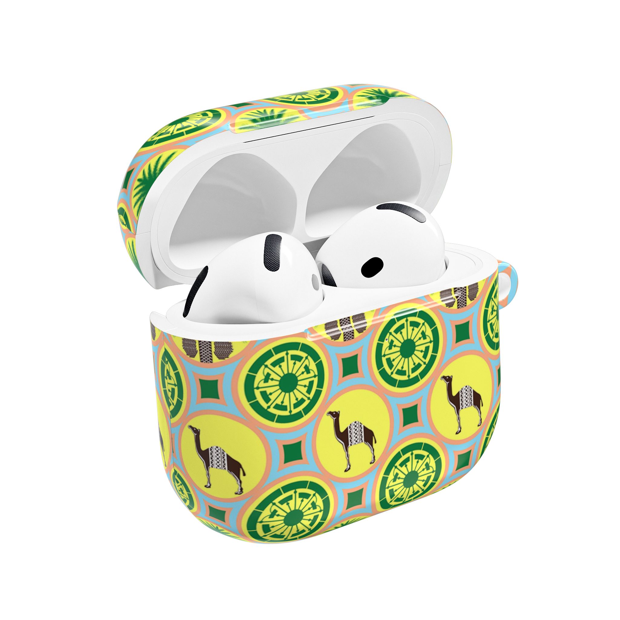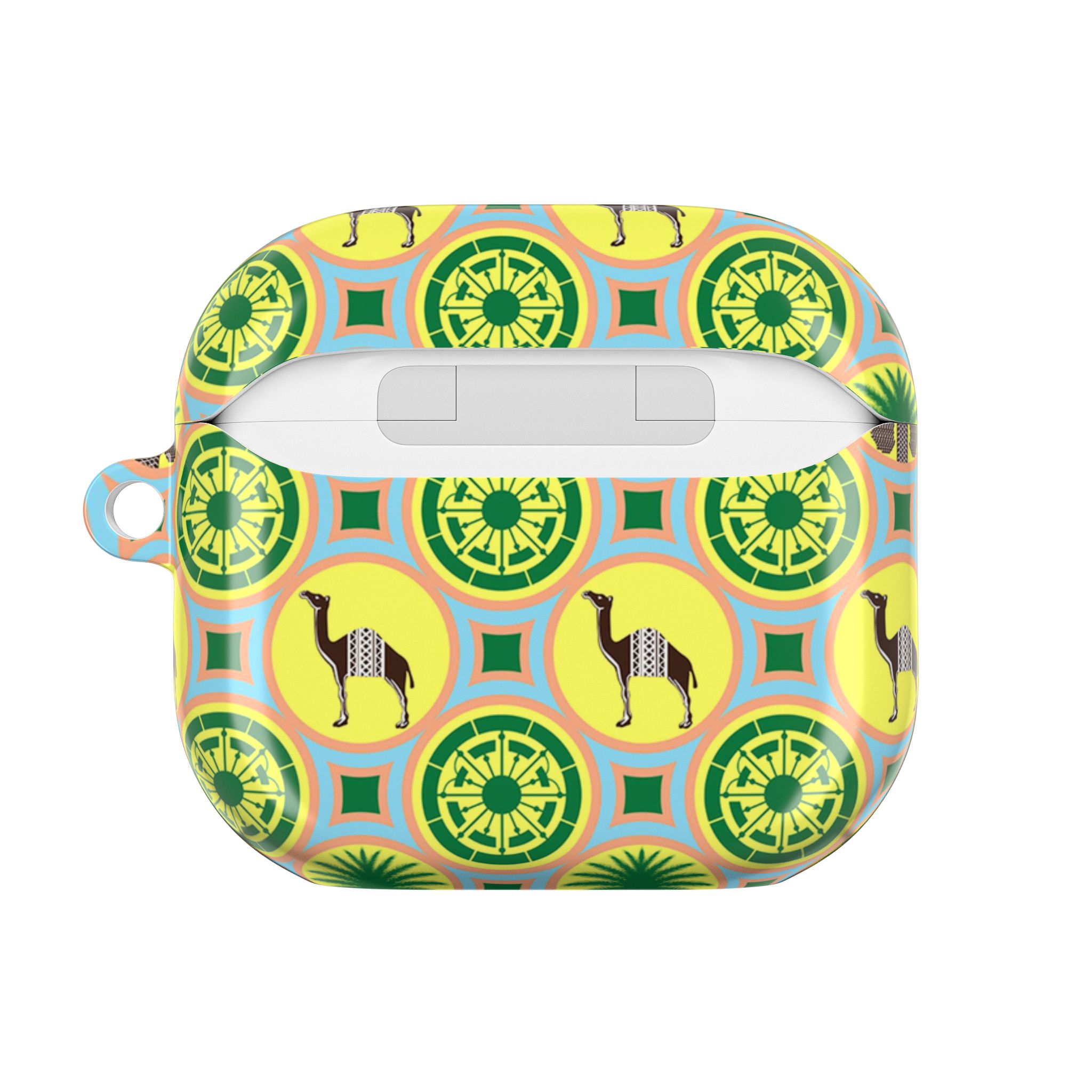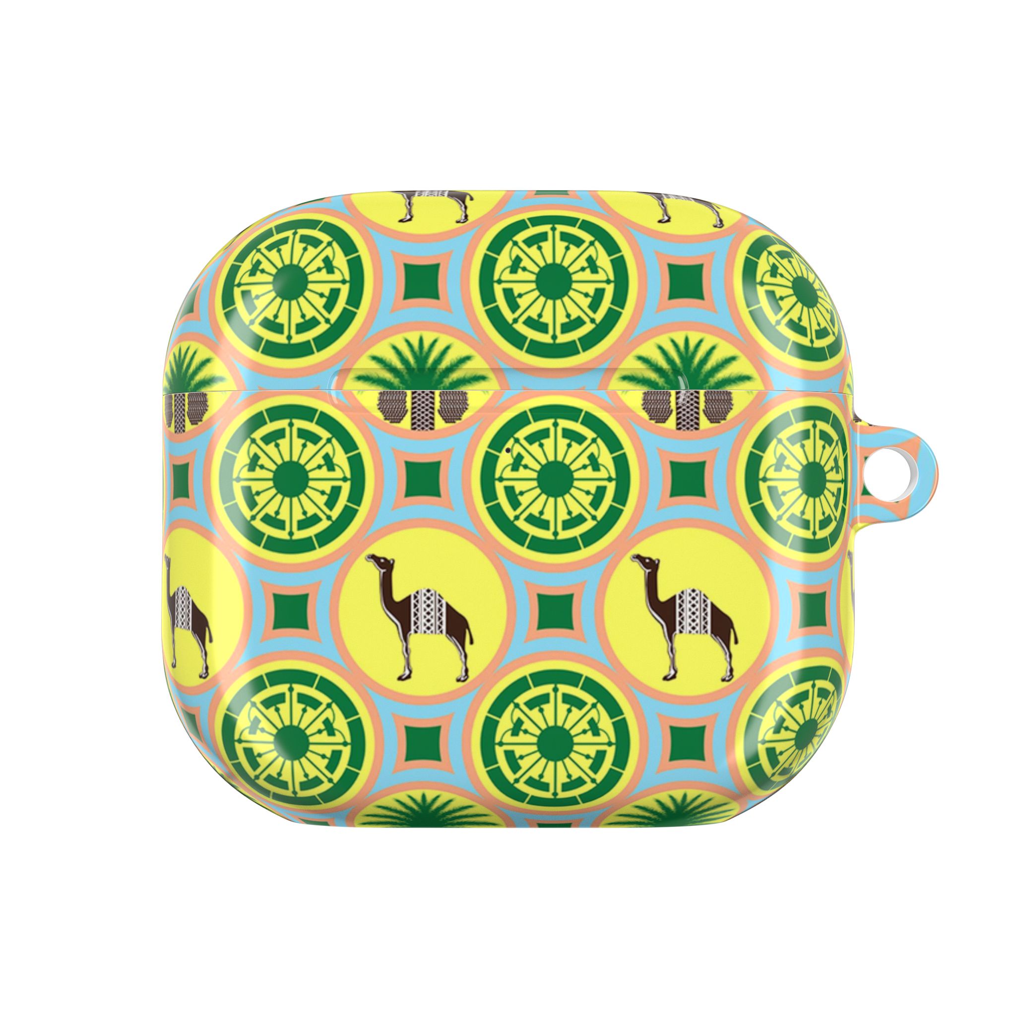 Bright, playful protection for your AirPods that turns a small everyday item into a joyful accent. The glossy polycarbonate shell feels sleek and light while standing up to daily bumps and scratches. A repeating motif of stylized camels, palm fronds, and geometric medallions in cheerful yellow and green gives the case a retro, travel-inspired vibe — like a tiny souvenir from an imagined sun-soaked market. The slim profile keeps wireless charging accessible and the included carabiner clips to a bag or belt loop so your earbuds are always within reach. Made in South Korea with durable materials and safety-conscious manufacturing, this case pairs practical protection with a burst of personality.